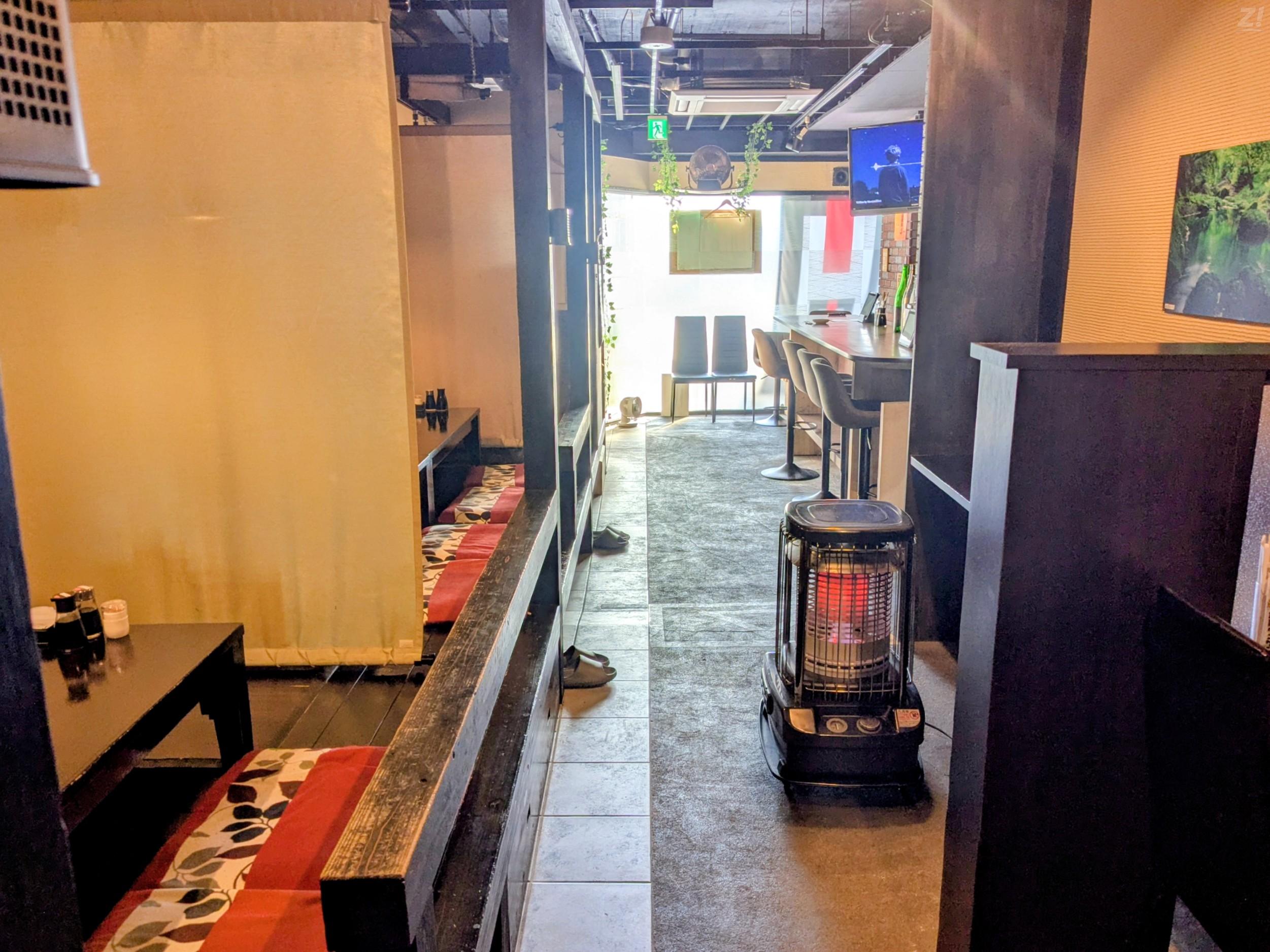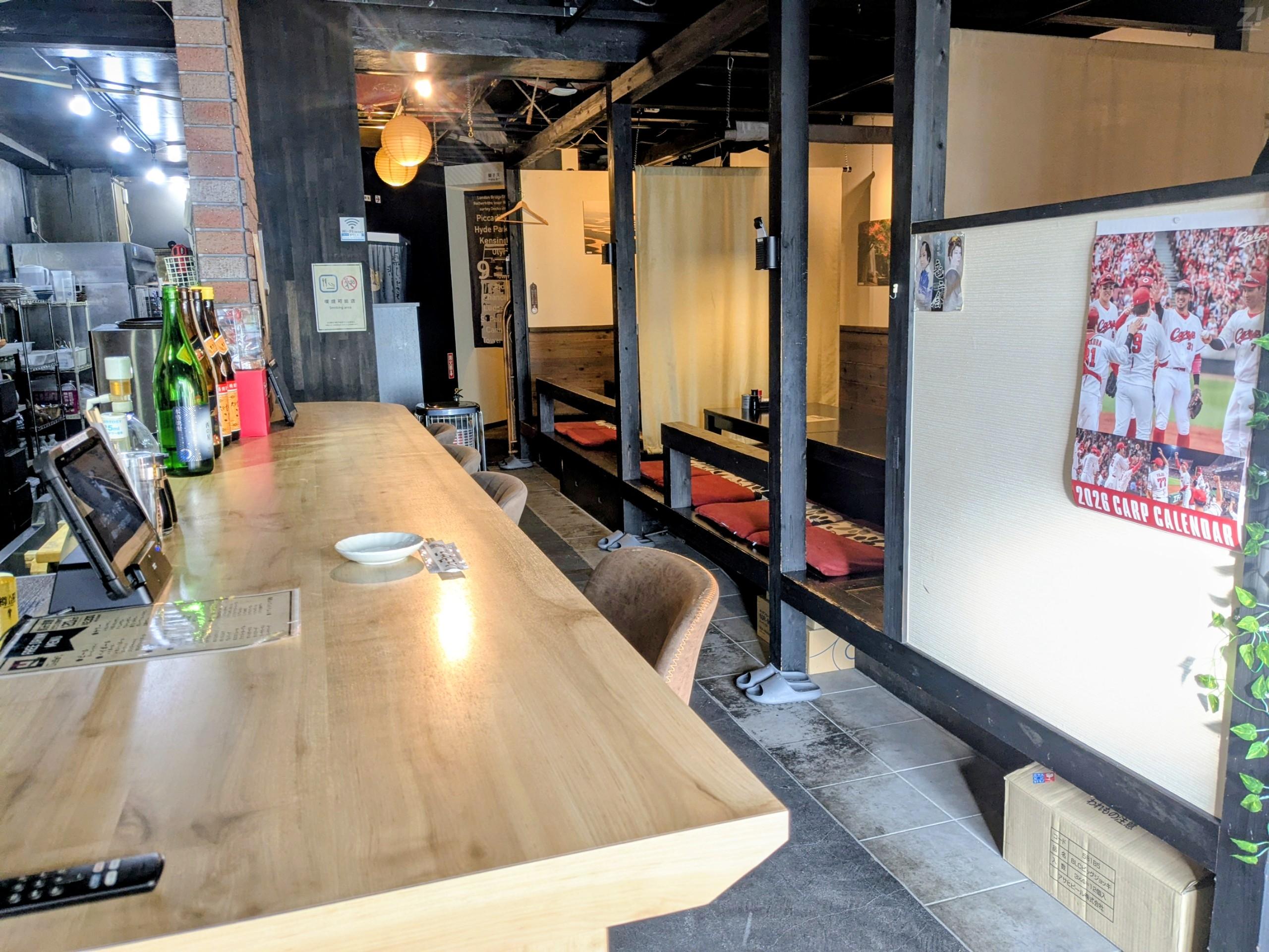 修行先として訪れた「IZAKAYAいっきゅう」、お席は掘りごたつ式のお座敷、4人掛けが4つ、カウンターが10席あります。