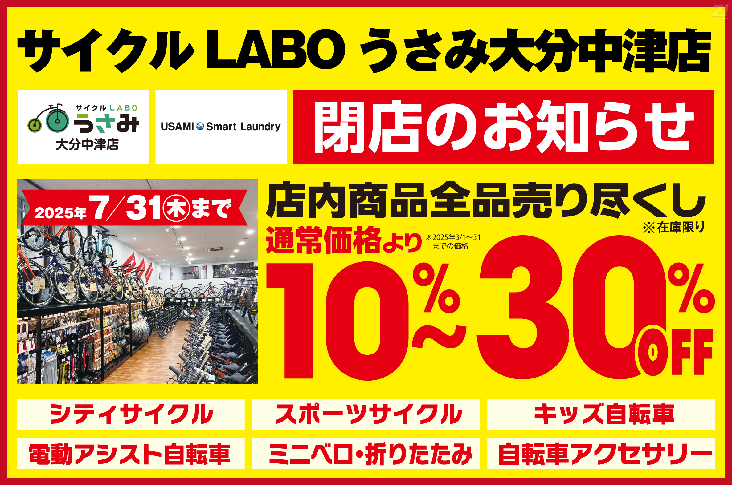 長年にわたり地元のサイクリストたちに親しまれてきた「サイクルLABOうさみ 大分中津店」が、2025年7月31日(木)をもって閉店することがわかりました。また、店舗敷地内に併設されているコインランドリー「USAMI Smart Laundry」も、同じく7月31日(木)17時をもって営業を終了します。