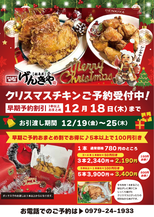 2025年のクリスマスに向けて、中津市の人気からあげ店「からあげ専門店 げんきや」がクリスマスチキンの予約受付を開始しました。