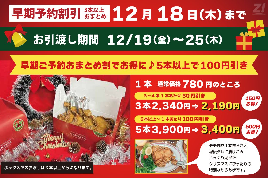 中津市「げんきや」クリスマスチキン予約受付開始!早期予約でお得に贅沢な一本を