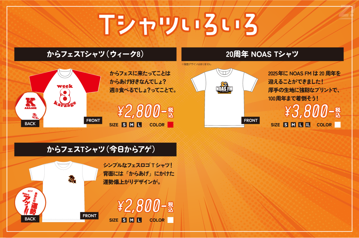 ステッカーやTシャツなど、人気の“からフェスグッズ”や“NOAS FM20周年記念Tシャツ”も数量限定で販売中。