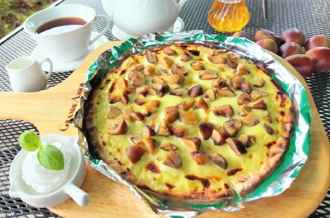 クラスト生地とカスタードの上にたっぷりの栗をトッピングし、ハニーディップとマスカルポーネを添えた一品です。地下水で淹れる水出し珈琲や紅茶とも相性抜群。