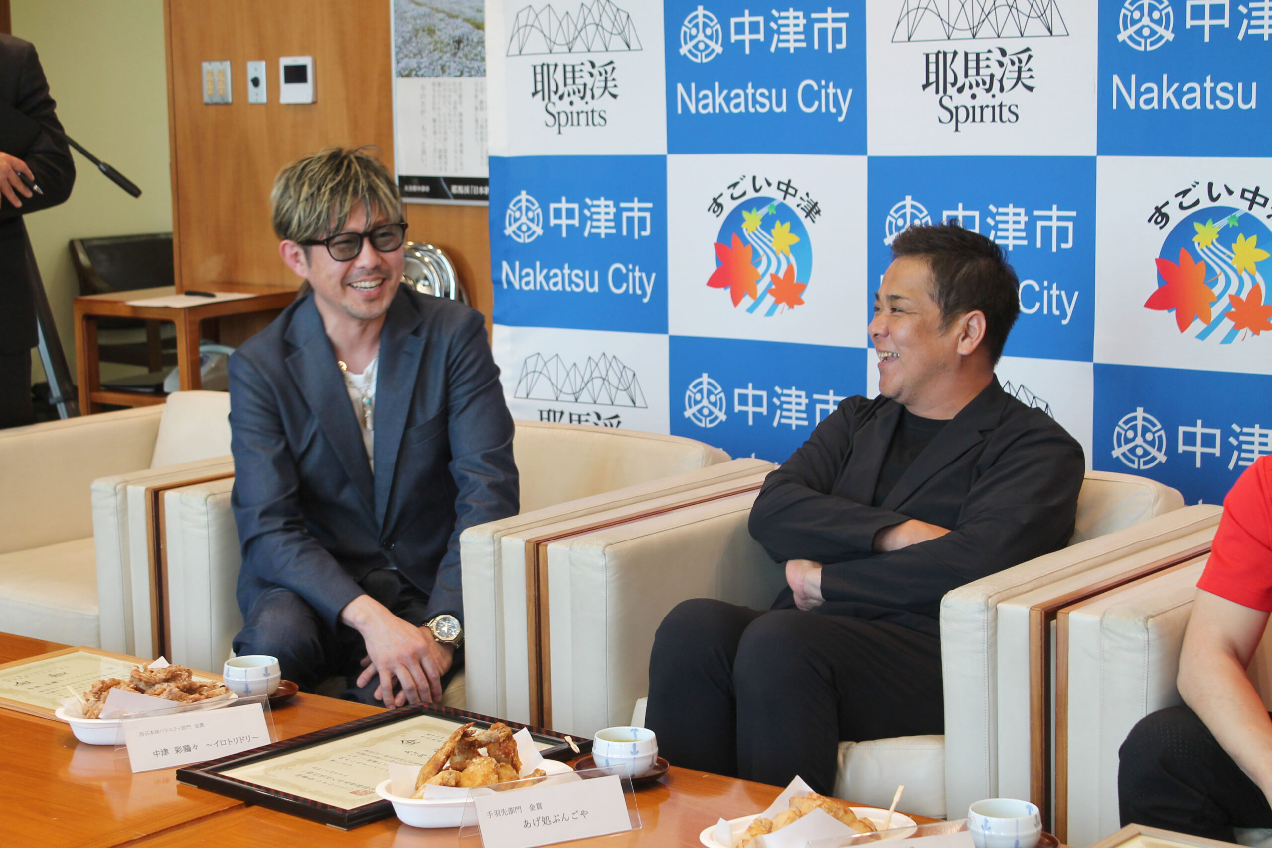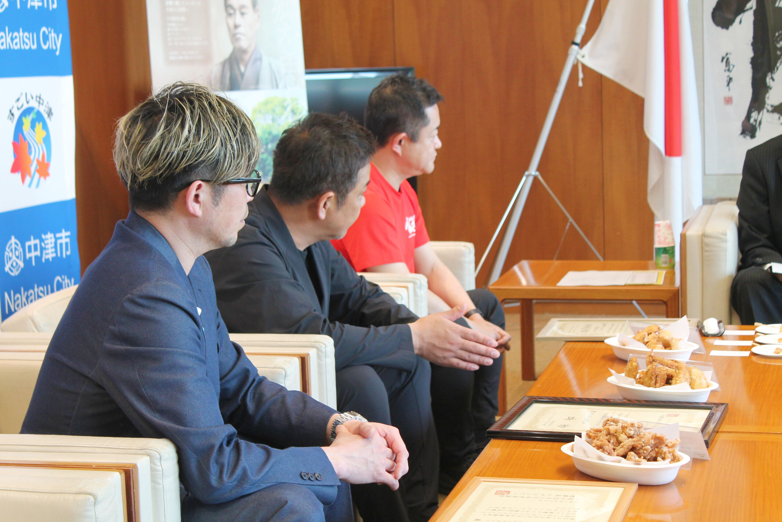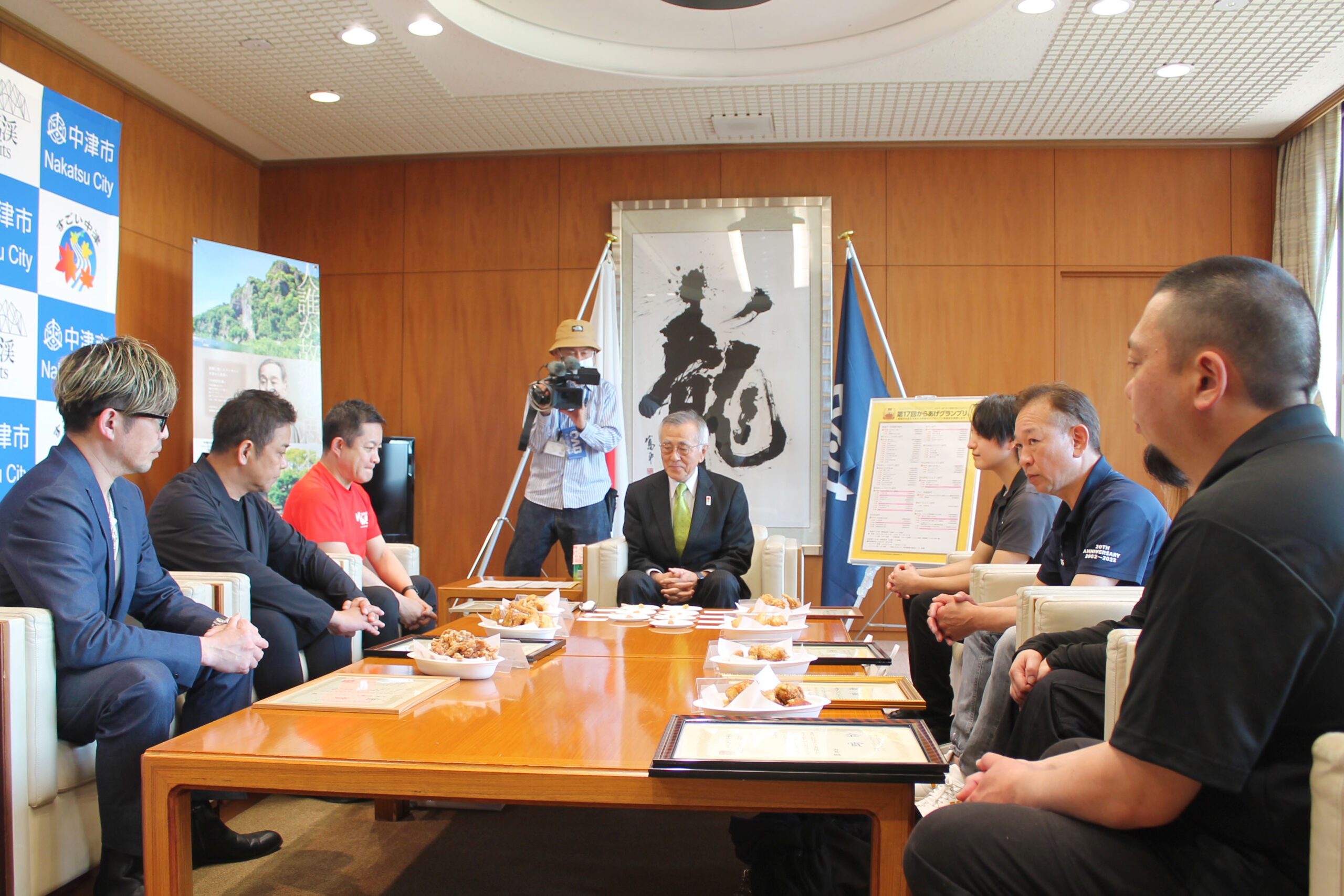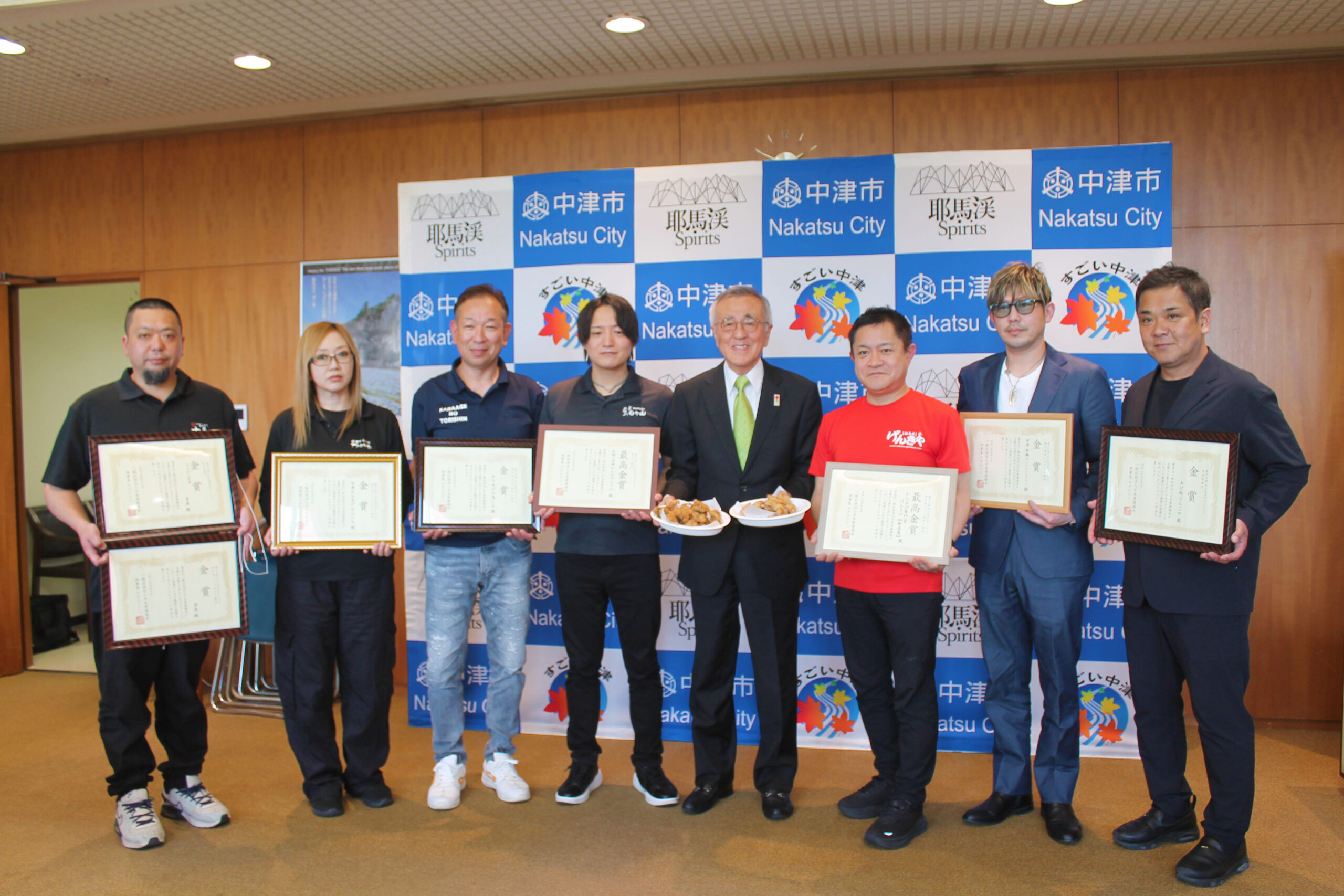 この輝かしい成績を記念し、4月27日、各店舗の代表者が中津市役所を訪れ、奥塚市長への表敬訪問を行いました。会場には自慢の揚げたて唐揚げが勢揃いし、香ばしい香りで出席者や報道陣を魅了しました。