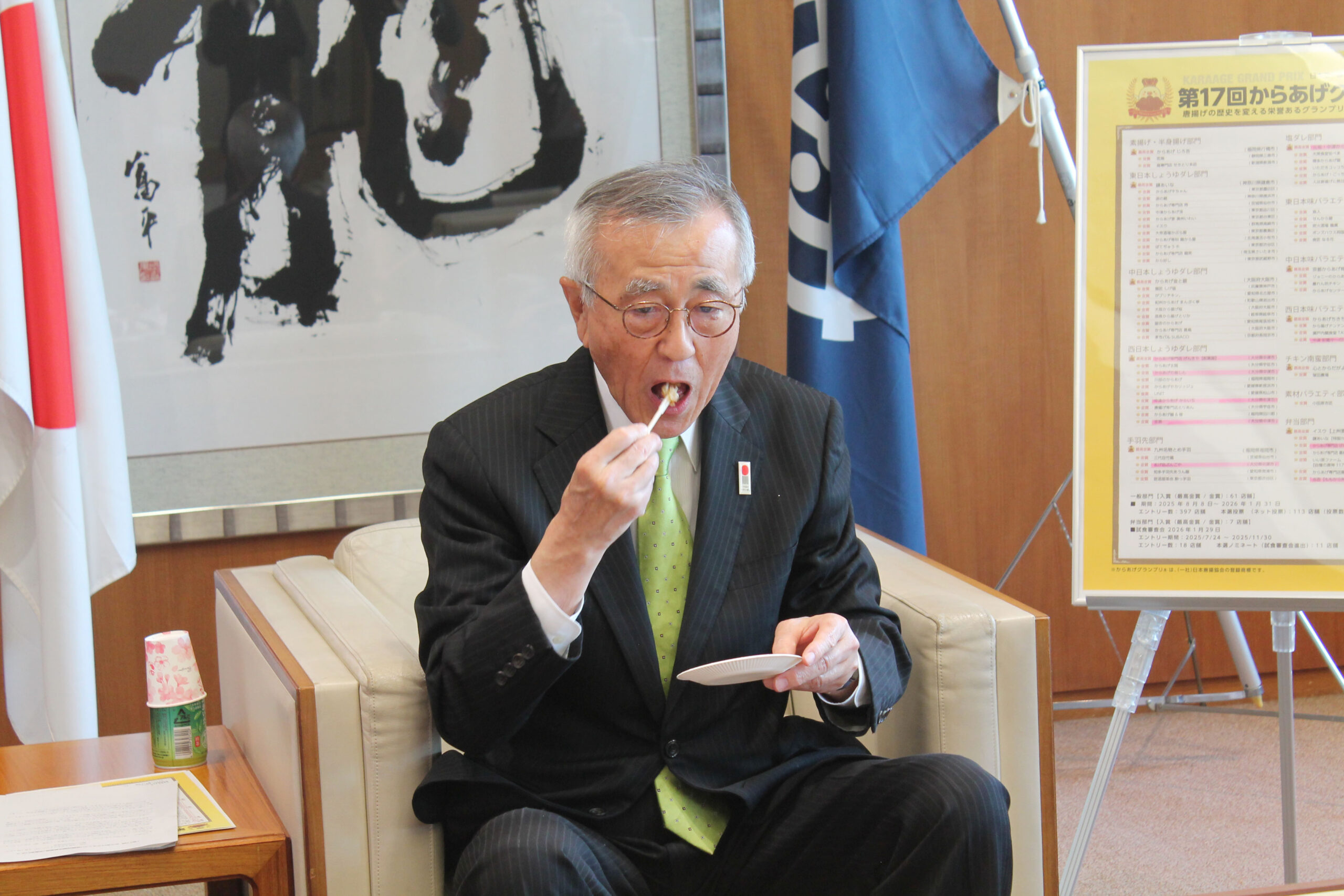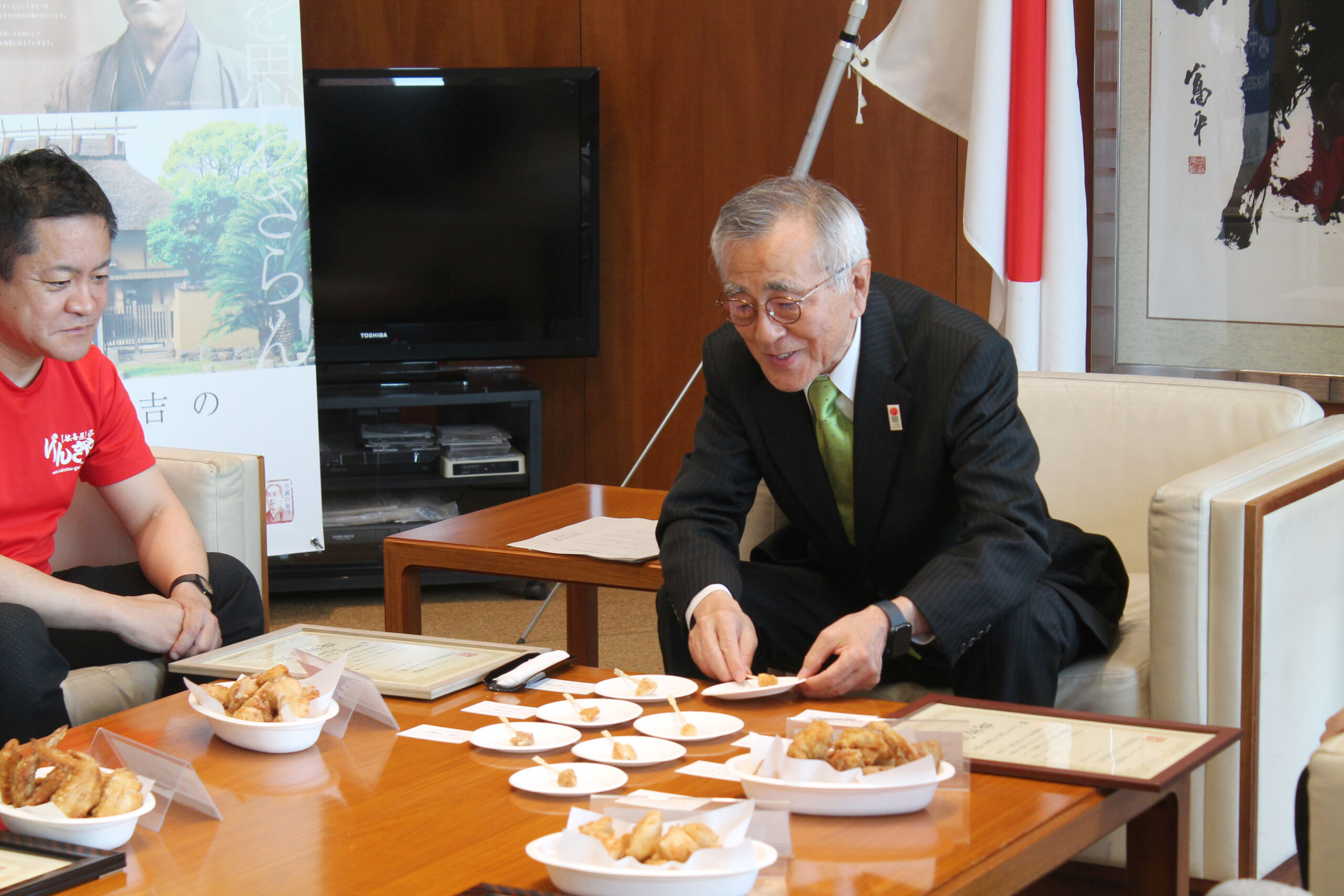 市長も実際に各店舗のからあげを試食。「やはりこだわりの胸肉は違う」「せせりの食感も素晴らしい」と、それぞれの店舗が追求する個性に太鼓判を押しました。
