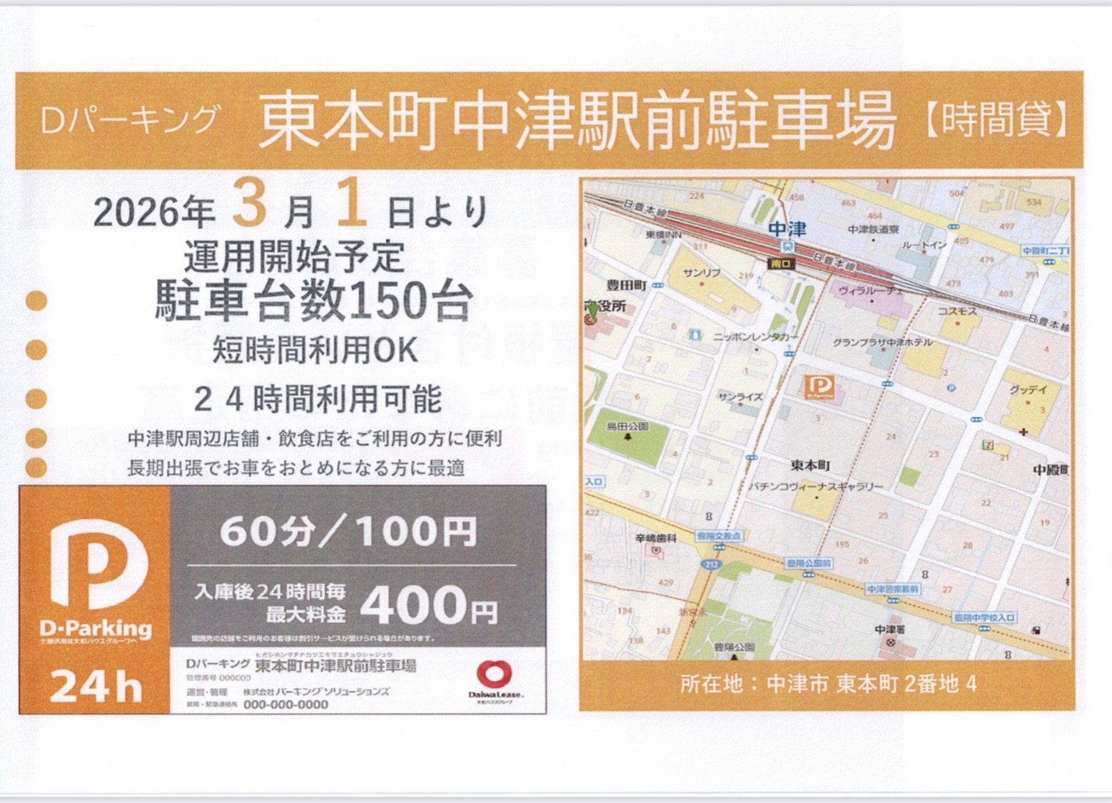 【駐車場難民に朗報】中津駅南口に爆安の「Dパーキング」誕生!24時間最大400円!!