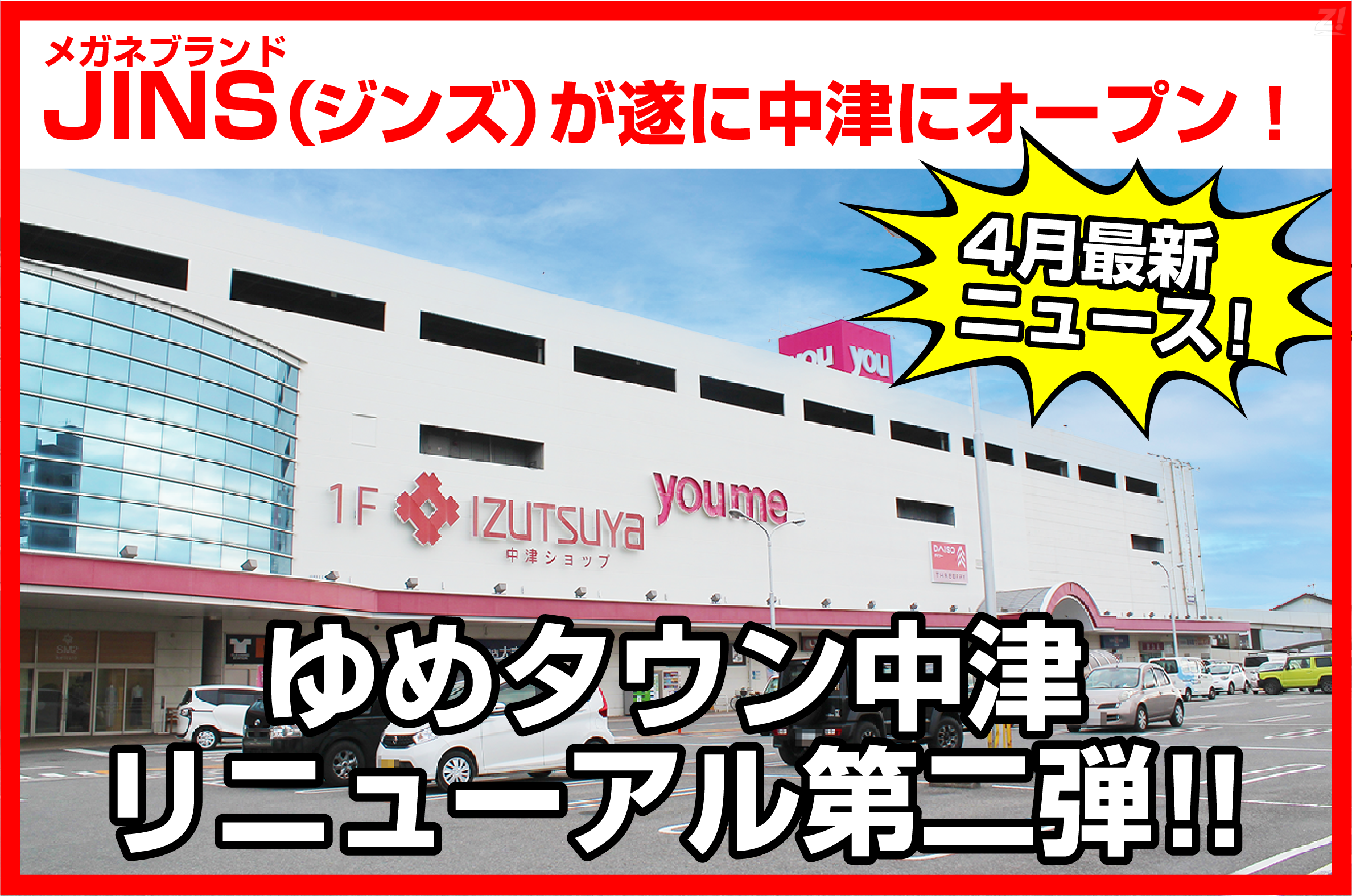 人気のメガネブランド「JINS」が、新たにゆめタウン中津にオープンします。