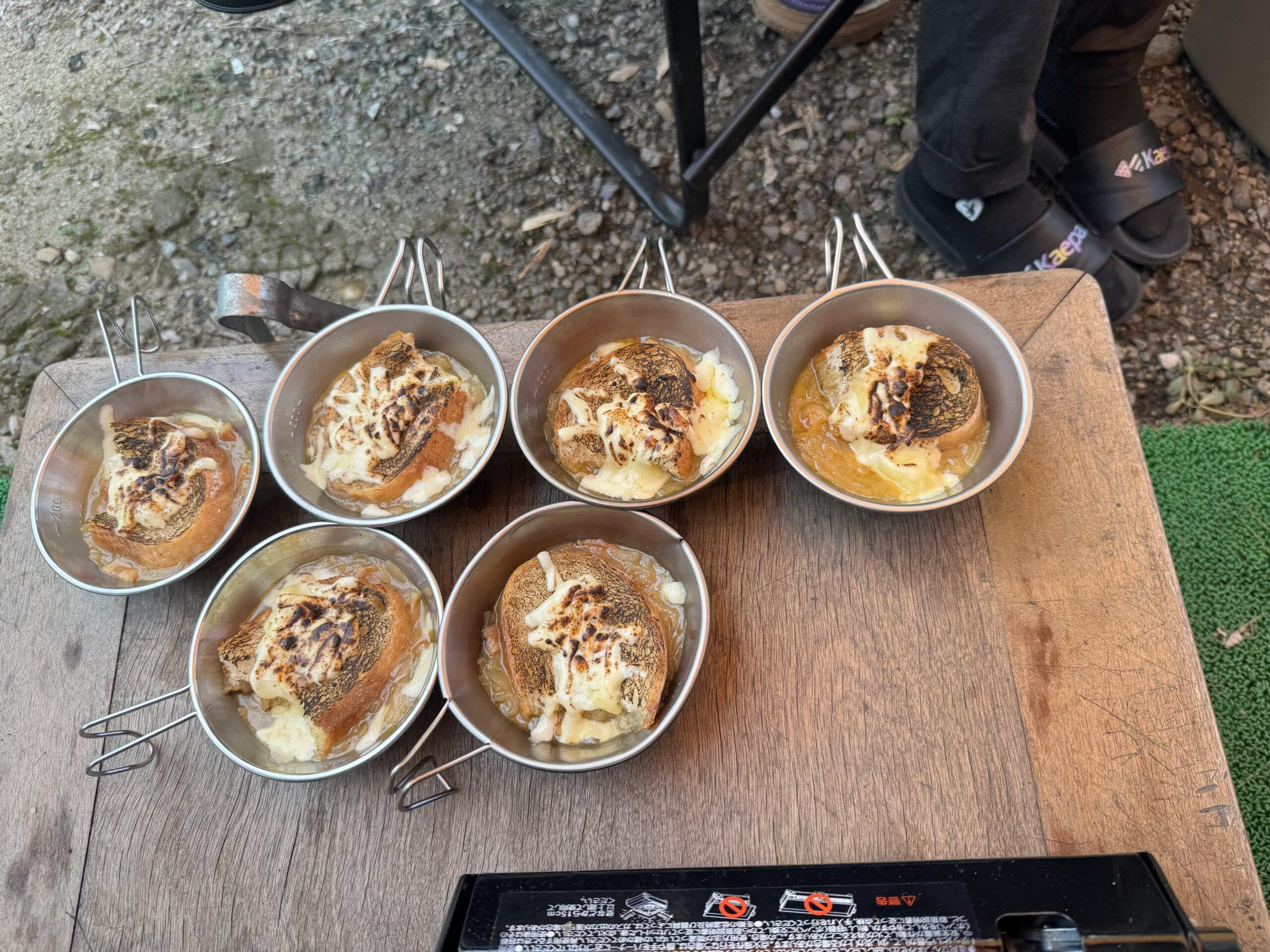出来立てオニオンスープにバーナーで表面をあぶったバケットをひたします。