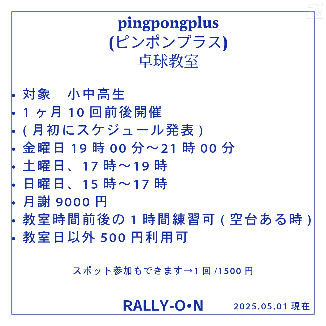 ピンポンプラス卓球教室 月10回前後 9,000円