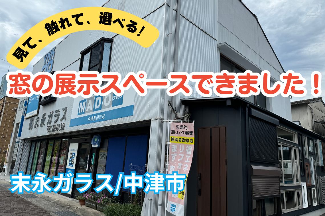 中津市島田、市役所前に位置する『有限会社末永ガラス』。「最近会社の前を通ると色んな種類の窓が見えるけど、一体なんだろう?」と気になっている方も多いのではないでしょうか?その通り!これ全部窓なんです!!こちらは、この度新設されたドア・窓の展示スペースとなっています。