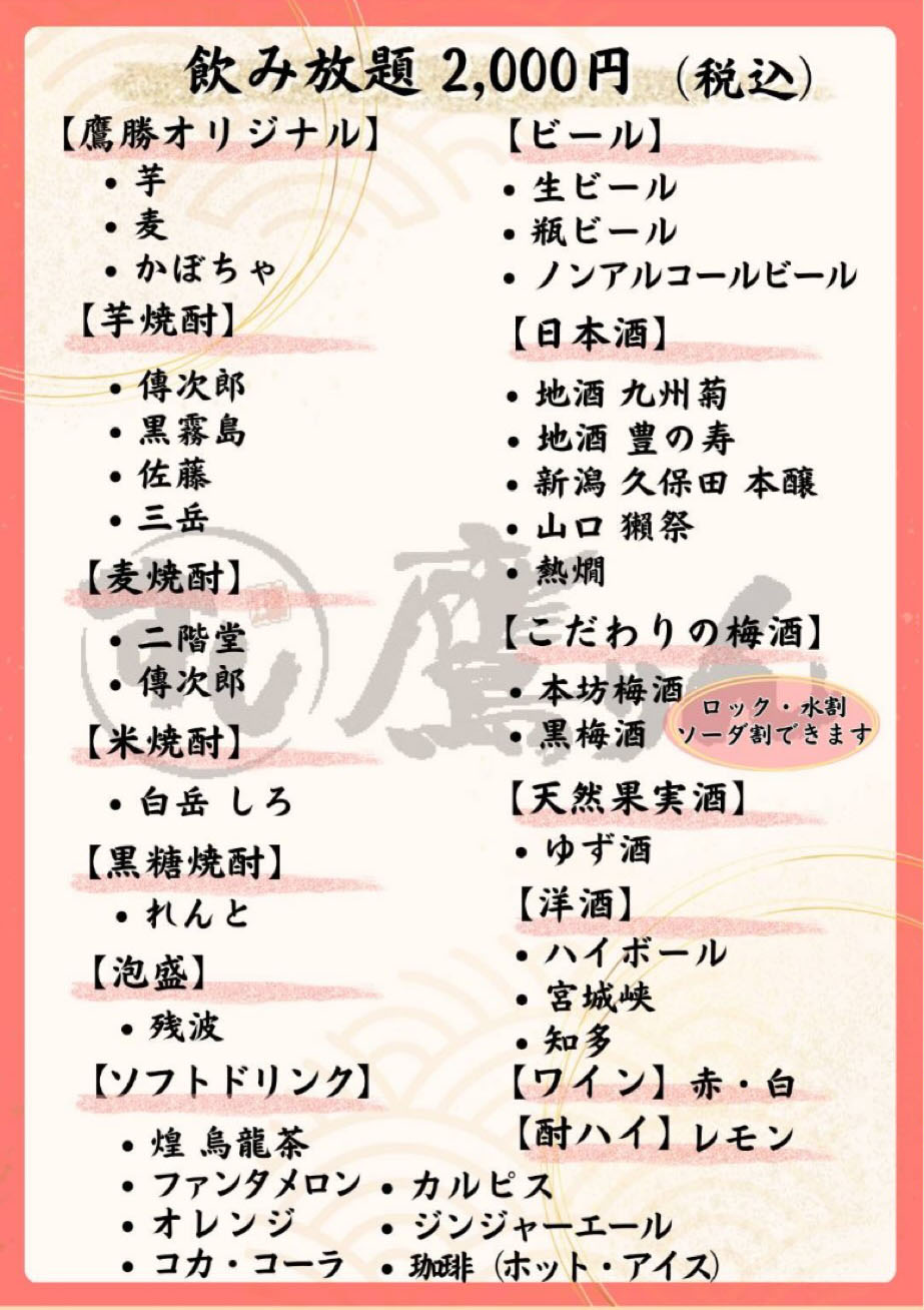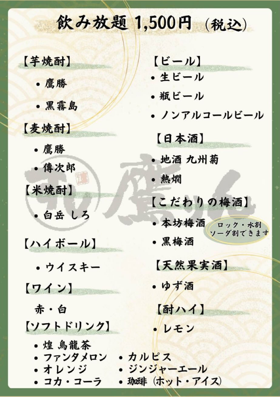 食べ放題の実施は平日は夜のみ、週末は全時間帯。別途1,500円または2,000円で飲み放題も追加可能です。