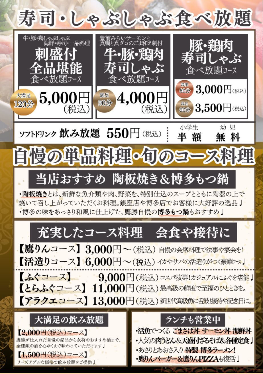 「こんなにクオリティが高いのに、食べ放題もやってるの?」と驚かれる方も多いはず。寿司・しゃぶしゃぶの食べ放題が大人1名3,000円〜5,000円というリーズナブルな価格で楽しめます。小学生は半額、未就学児は無料なので、家族みんなで気兼ねなく楽しめます。
