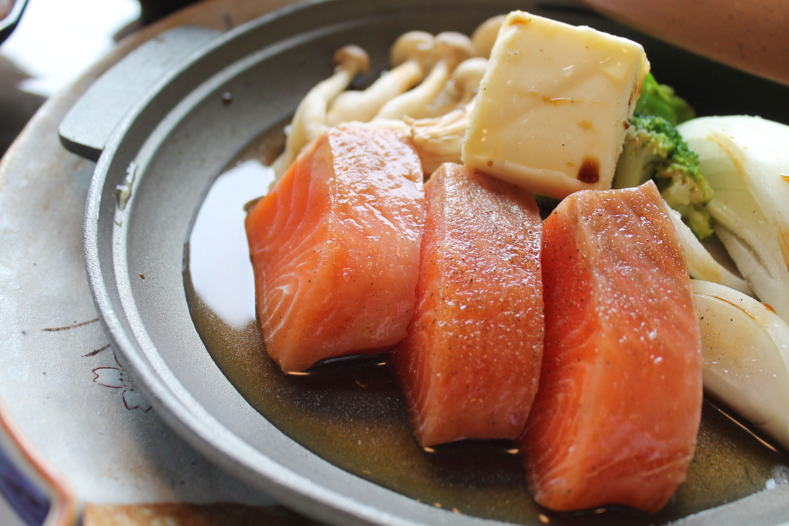 肉厚にカットされたサーモンは陶板焼きにするとふっくら食感に。脂っこさがなくさっぱりといただけるのに旨みは抜群で、とろけるような柔らかさは品質の良さと産地直送ならではの鮮度があってこそ。実は鷹勝カレントの社長と豊前みらいサーモンの篠崎社長も親交があり、「一緒に豊前市とサーモンを盛り上げよう」という熱い思いからこのメニューが生まれました。