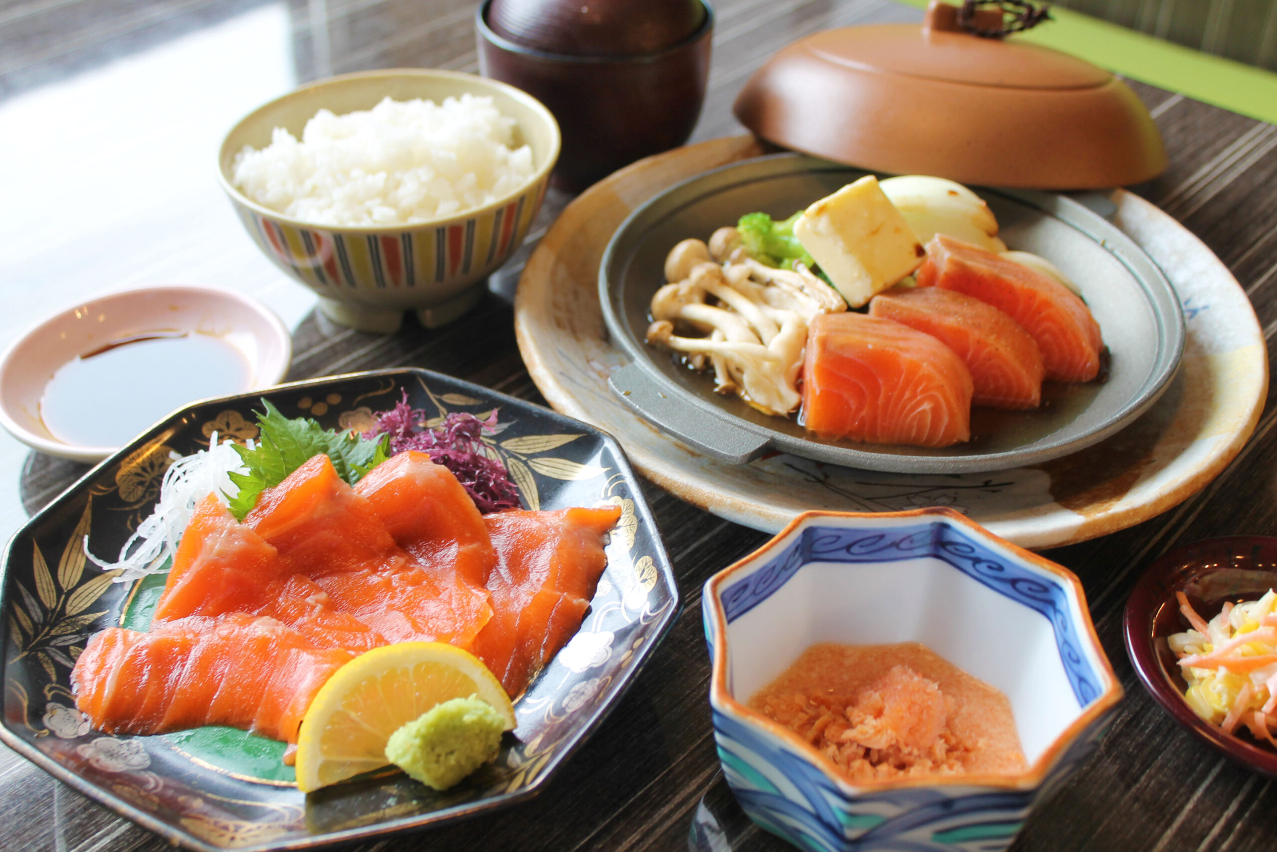 豊前市で大切に育てられたブランド養殖魚「豊前みらいサーモン」をこれでもかと詰め込んだ定食です。みらいサーモンと野菜・きのこ・バターの陶板焼き、サーモンの刺身、さらに自家製明太子を使ったとろろ明太まで、みらいサーモンを余すところなく味わい尽くせる構成。