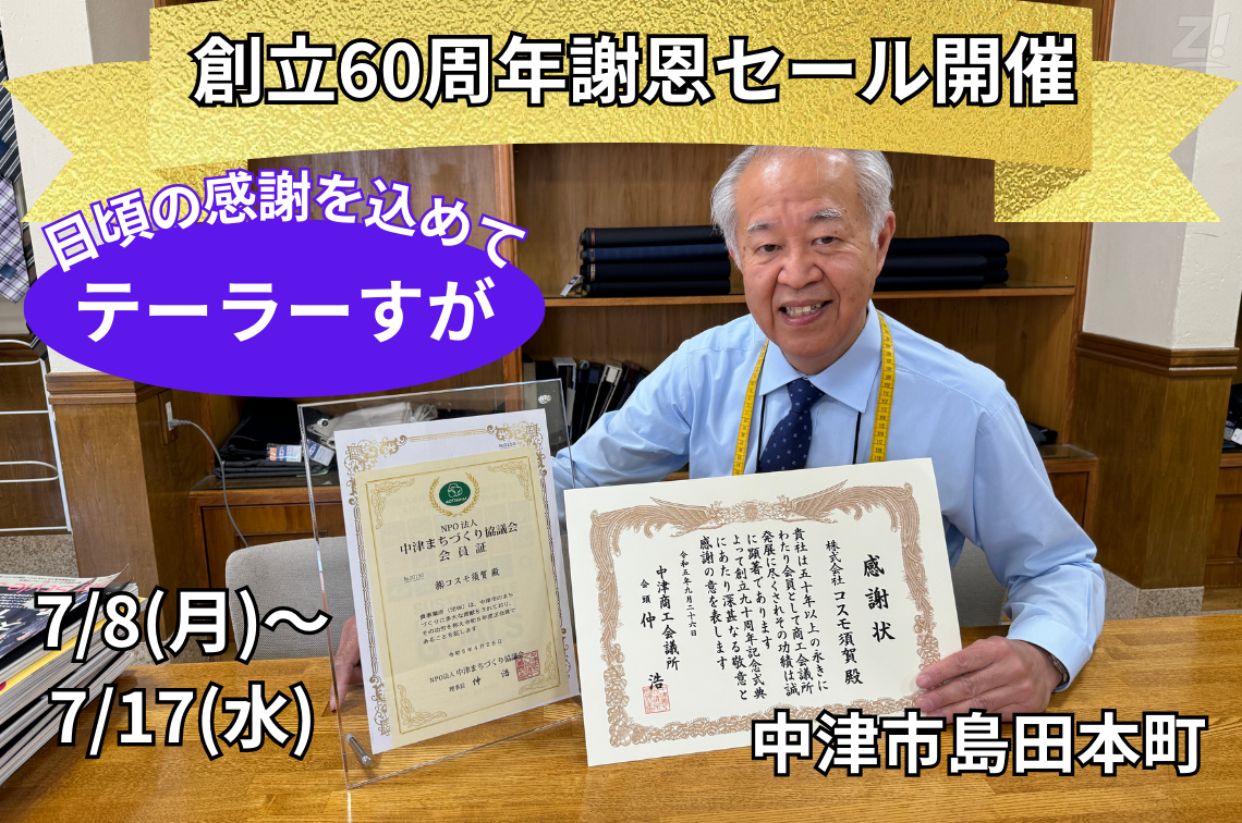 ※終了しました※7/8(月)~7/17(水)『テーラーすが』創立60周年謝恩セール開催!/中津市