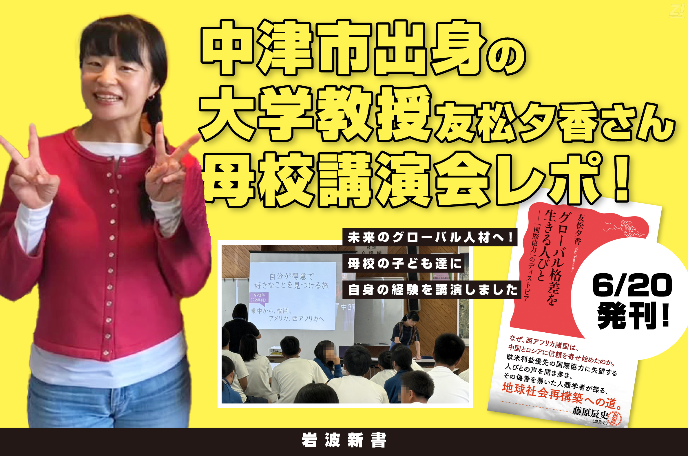 2025年7月14日、大分県中津市立東中津中学校にて、法政大学教授・経済人類学者の友松夕香氏による特別講演が開催されました。これは、同氏が執筆した岩波新書の最新刊『グローバル格差を生きる人びと――「国際協力」のディストピア』(岩波書店、2025年6月刊)の出版を記念して行われたものです。