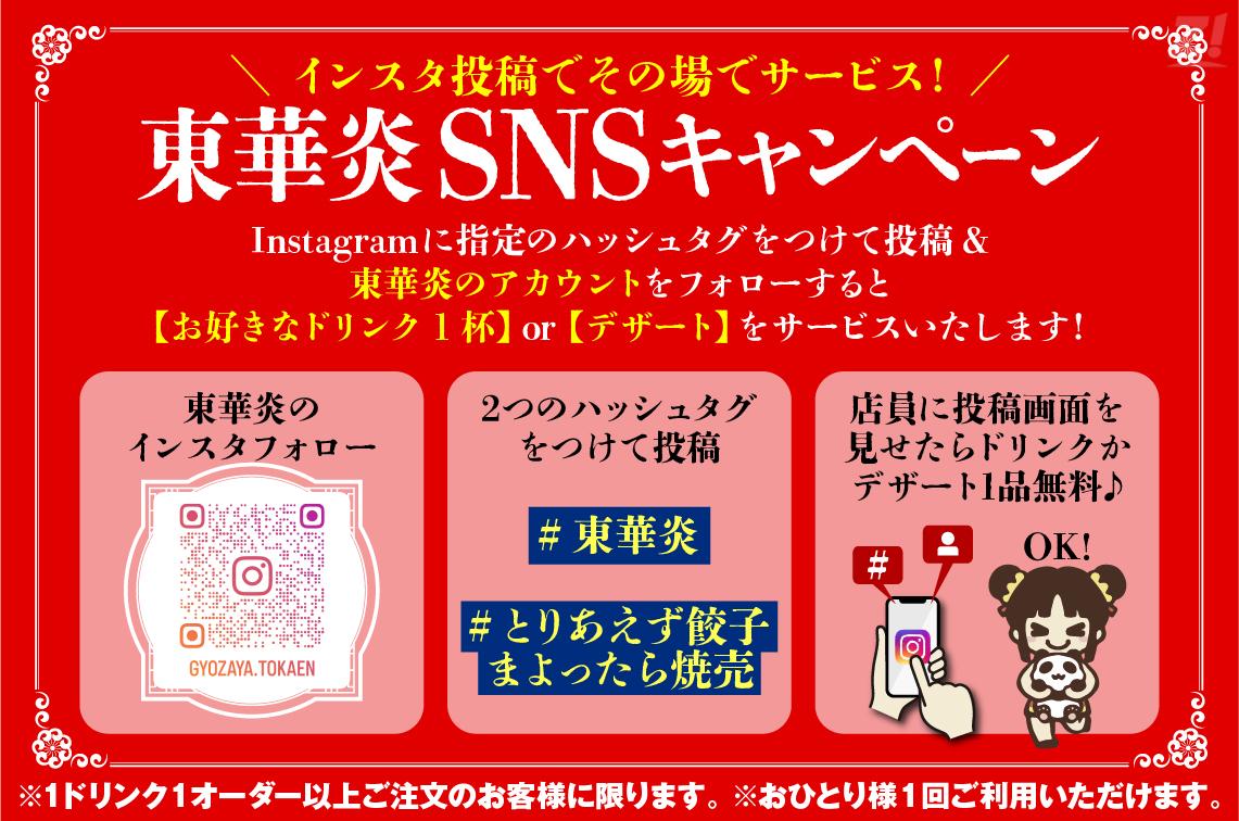 【餃子居酒屋 東華炎】インスタフォロー&ハッシュタグ投稿で1品無料キャンペーン!