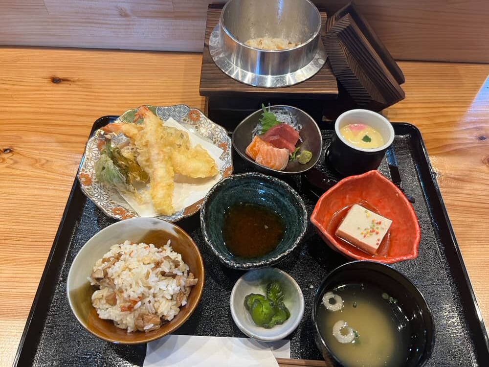 運ばれてきてビックリ!大きな羽釜の釜飯をメインに、揚げたての天ぷら、新鮮なお刺身、そして手の込んだ小鉢がセットになっています。「えっ、この内容で1,600円でいいの!?」と思わず二度見してしまうほどのボリュームとクオリティです。