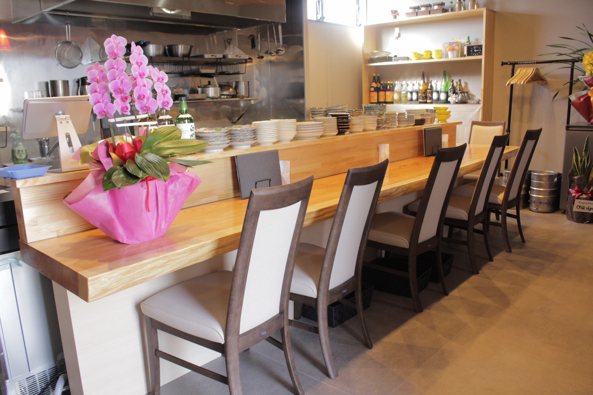 カウンター席: お一人様でも気兼ねなく、職人の手仕事を間近に見ながら食事を楽しめます。