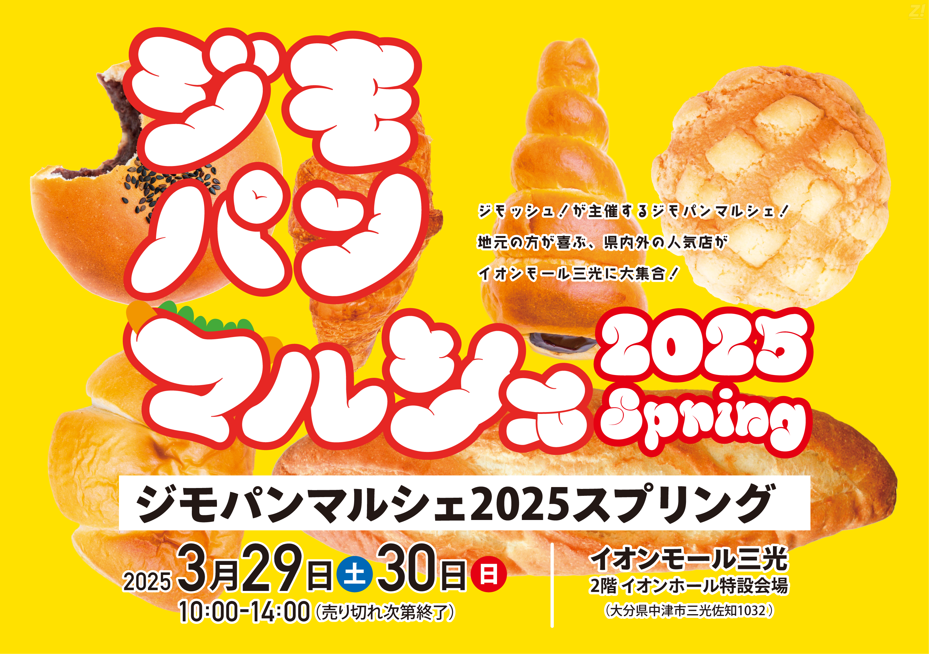 今回で第4回目となる大人気イベント、美味しいパンが一堂に会する「ジモパンマルシェ2025スプリング」を、2025年3月29日(土)と30日(日)の2日間、イオンモール三光で開催します。