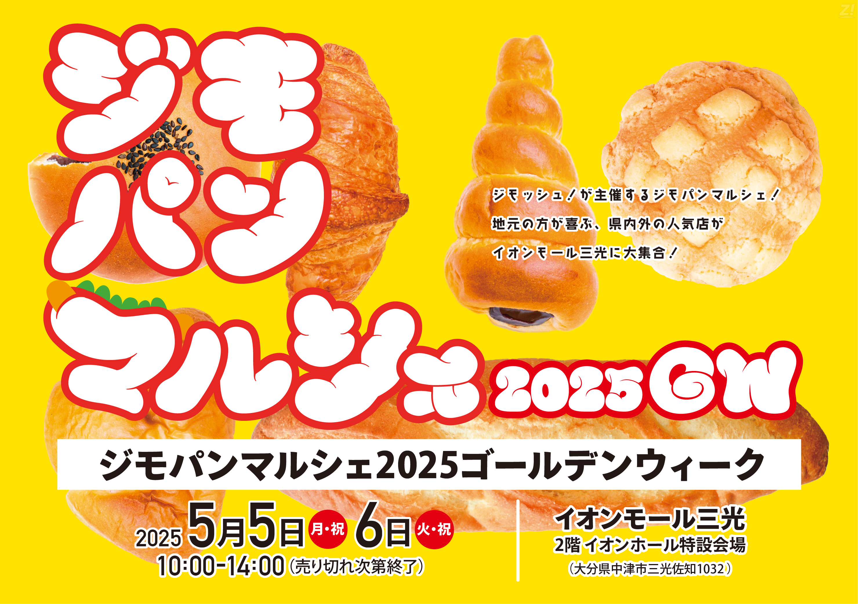 ゴールデンウィークの5月5日(月・祝)・6日(火・休)の2日間、イオンモール三光でパン好きにはたまらないイベント「ジモパンマルシェ2025ゴールデンウィーク」が開催されます!